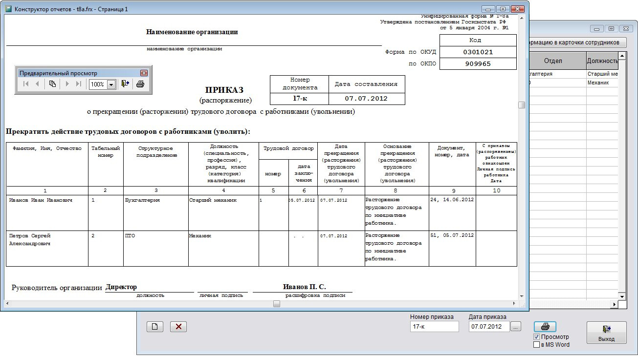 Для печати создания и приказа откройте журнал сотрудников и нажмите кнопку "Отчеты".