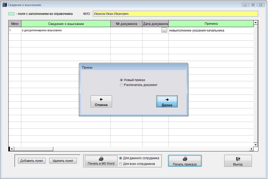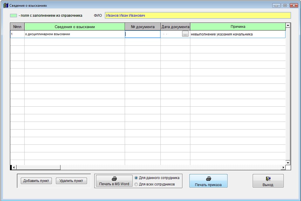 Для печати приказа о взыскании сотрудника в разделе "Сведения о взысканиях" выберите нужную запись в таблице и нажмите кнопку "Печать приказа".
