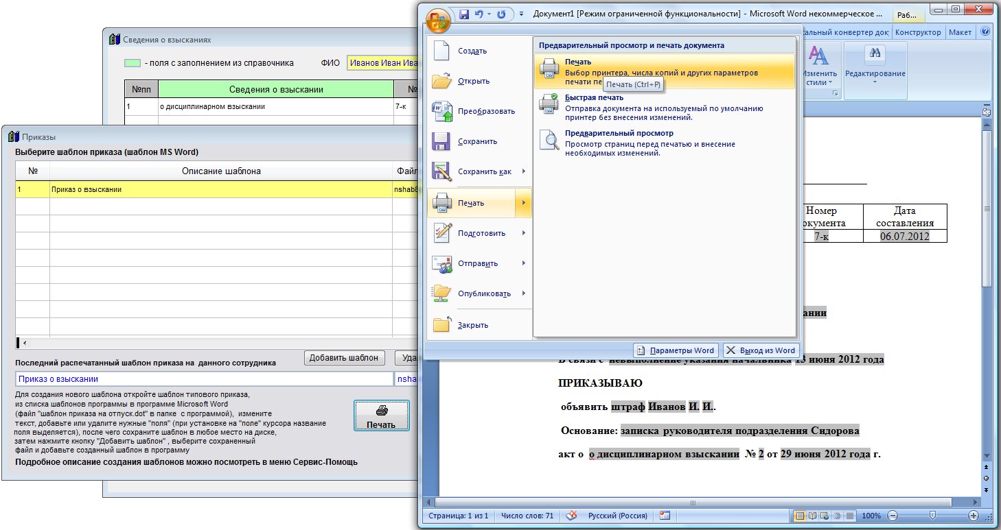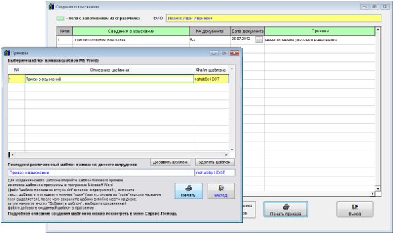 Откроется окно, в котором можно распечатать приказ о взыскании на базе шаблона, добавить в программу свои шаблоны приказов.