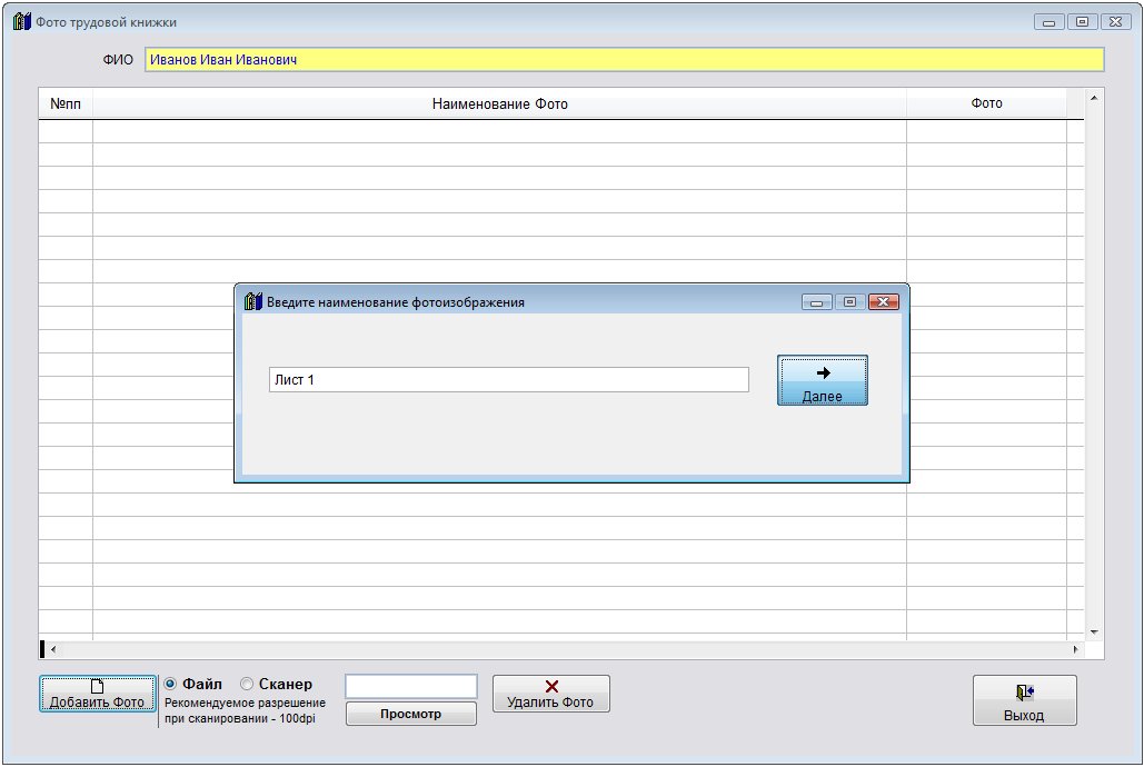 Для внесении отсканированных листов трудовой книжки сотрудника откройте карточку сотрудника на редактирование (кнопка Изменить карточку в журнале сотрудников) и нажмите кнопку "ФотоТруд.Книжки" в закладке "Трудовая деятельность".