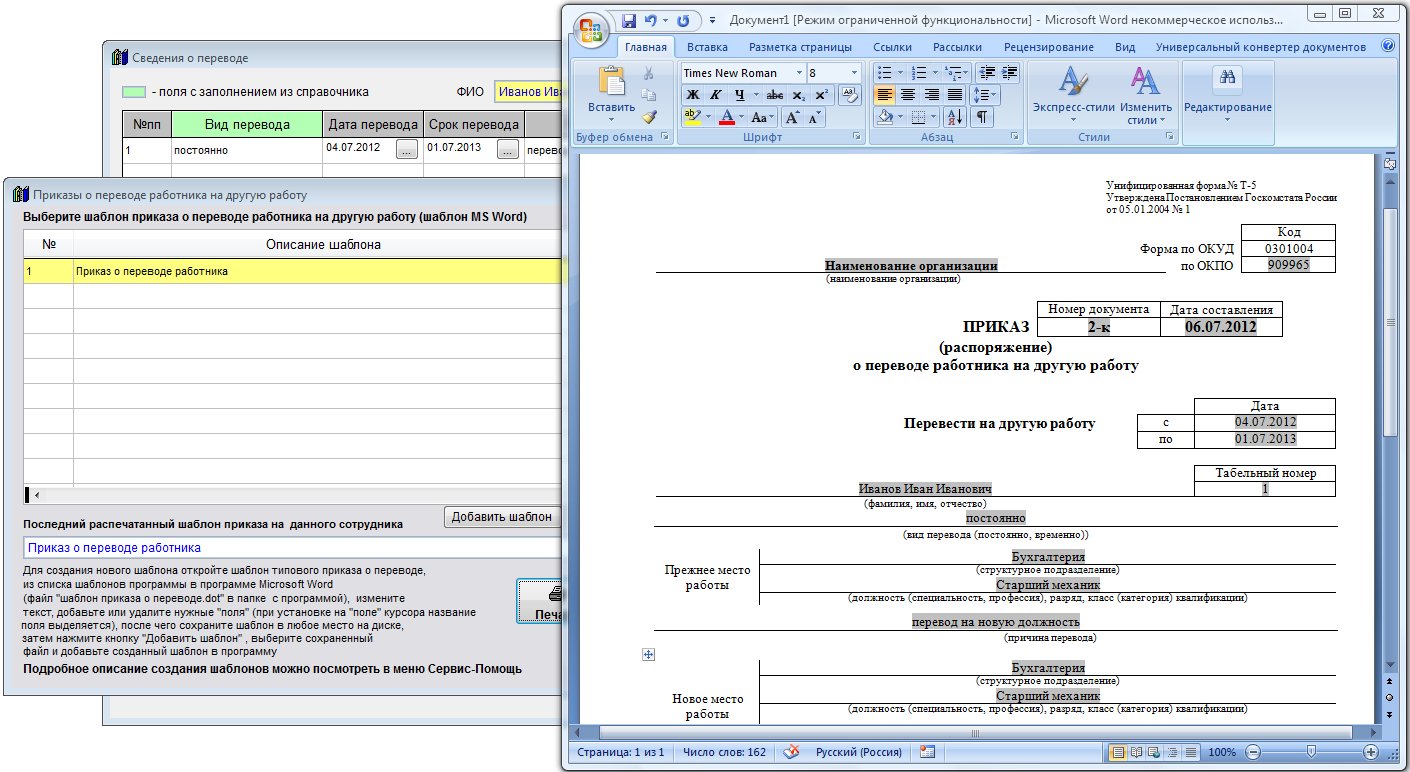 Приказ о переводе Т-5 сформируется в установленном Microsoft Word либо при соответствующей настройке в OpenOffice Writer.