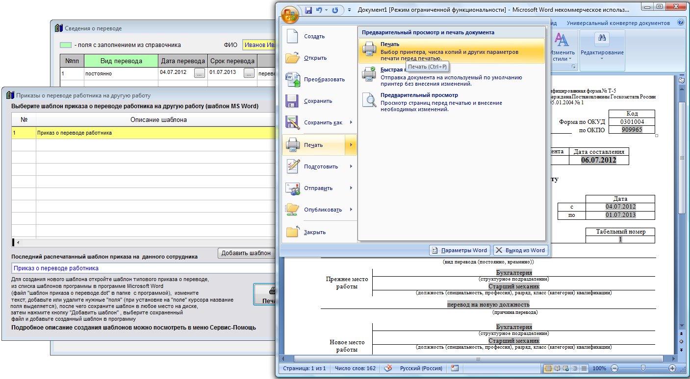 Откроется окно, в котором можно распечатать приказ о переводе Т-5 на базе шаблона, добавить в программу свои шаблоны приказов.