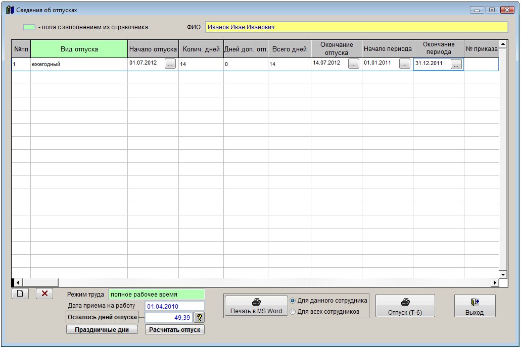 Предварительно должна быть добавлена запись с информацией об отпуске.