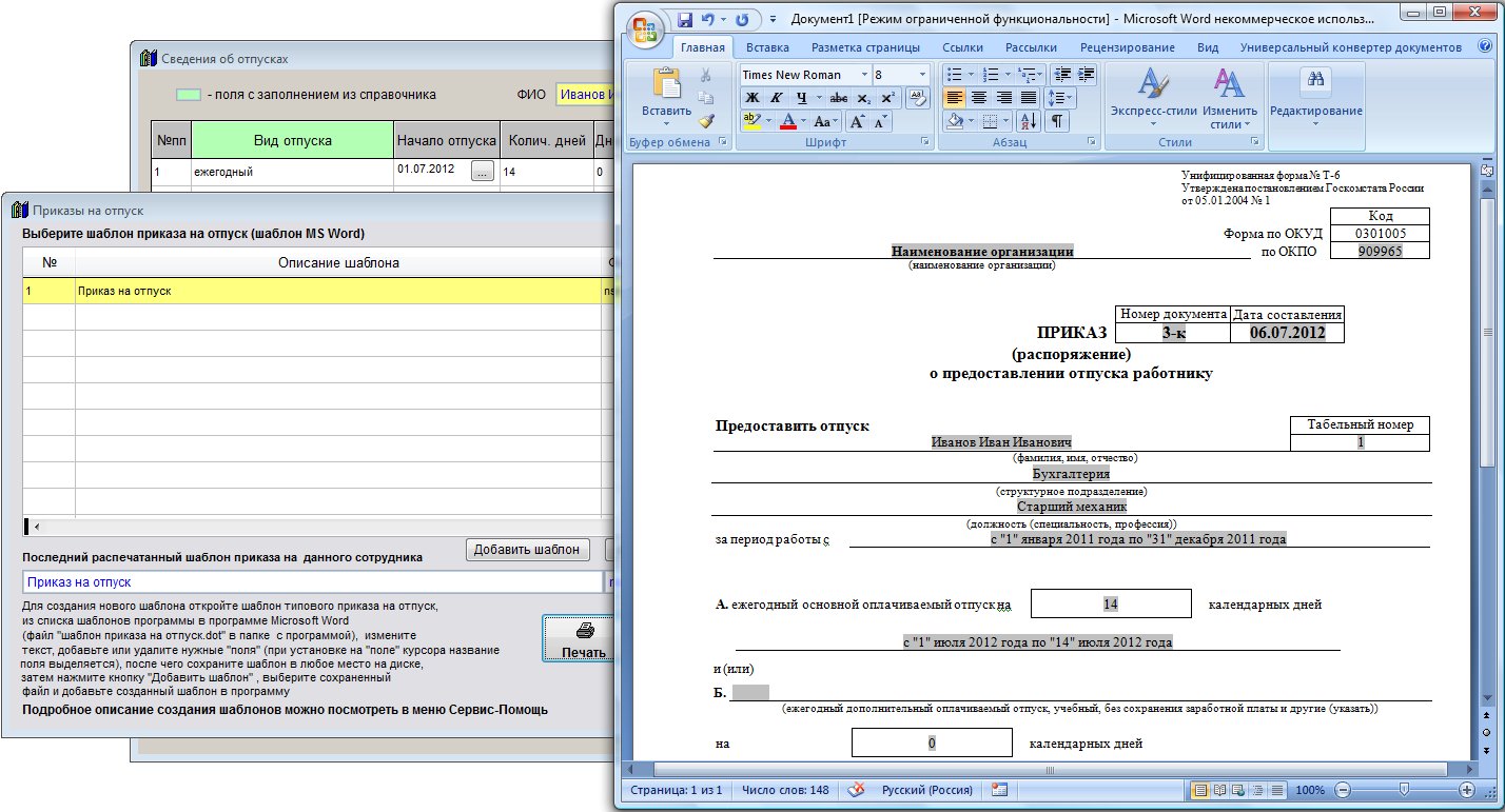 Приказ на отпуск Т-6 сформируется в установленном Microsoft Word либо при соответствующей настройке в OpenOffice Writer.