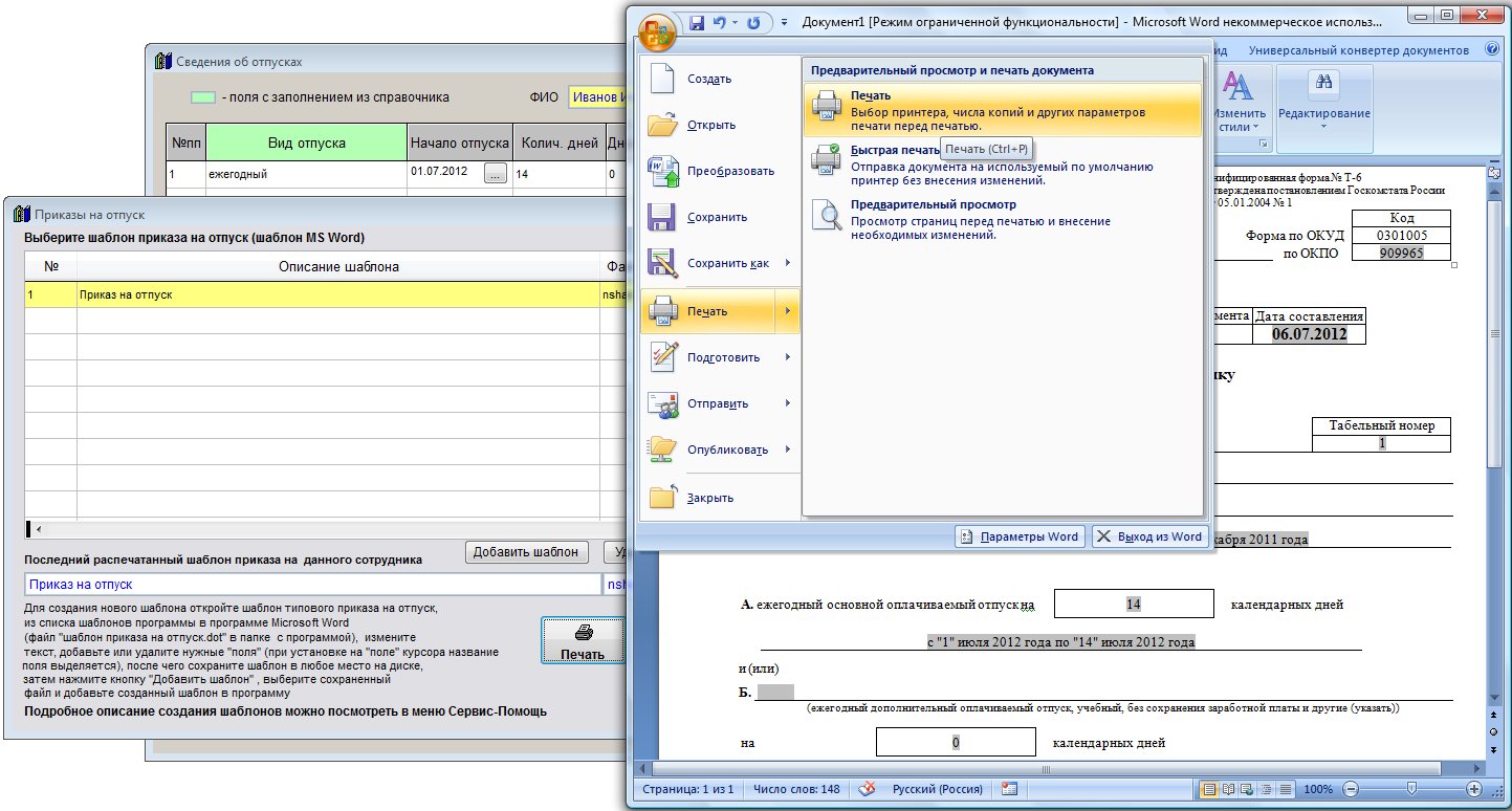 Откроется окно, в котором можно распечатать приказ на отпуск Т-6 на базе шаблона, добавить в программу свои шаблоны приказов.