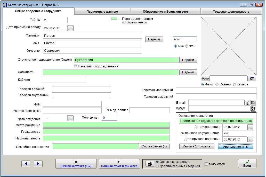 Нажмите кнопку "Уволить сотрудника", введите основание увольнения, номер и дату приказа.