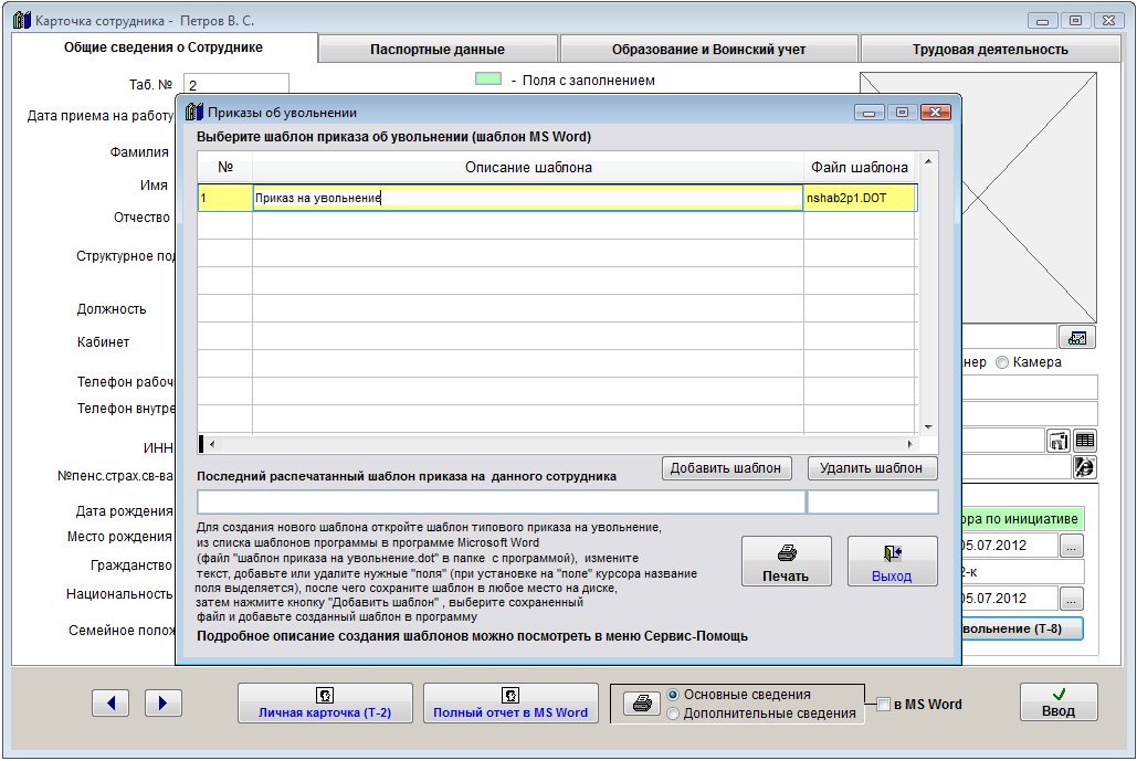 Откроется окно, в котором можно распечатать приказ об увольнении Т-8 на базе шаблона, добавить в программу свои шаблоны приказов.