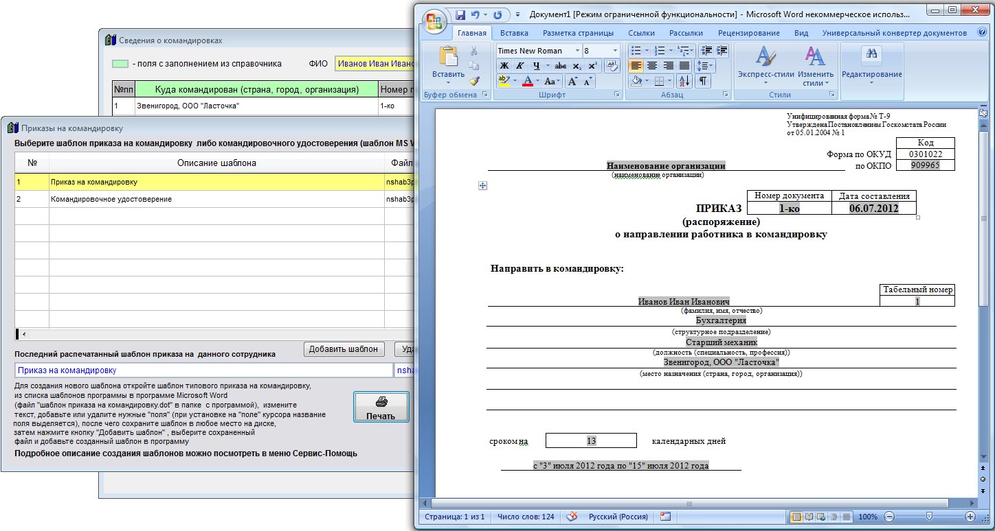 Приказ на командировку Т-9 сформируется в установленном Microsoft Word либо при соответствующей настройке в OpenOffice Writer.