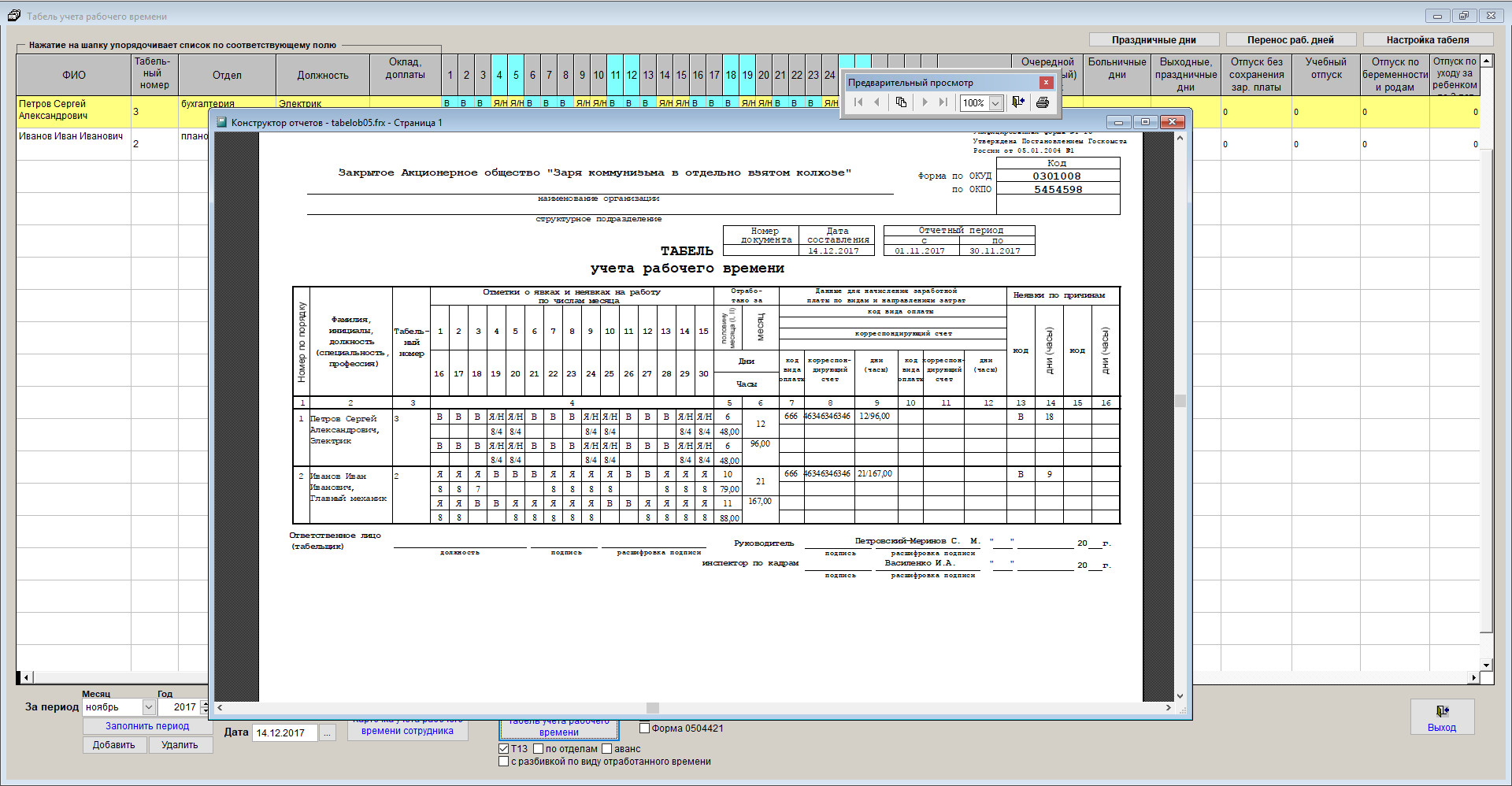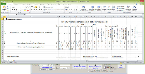 Табель будет заполнен в соответствии с графиками работы сотрудников, заданными условными обозначениями и содержимым разделов карточки сотрудников.