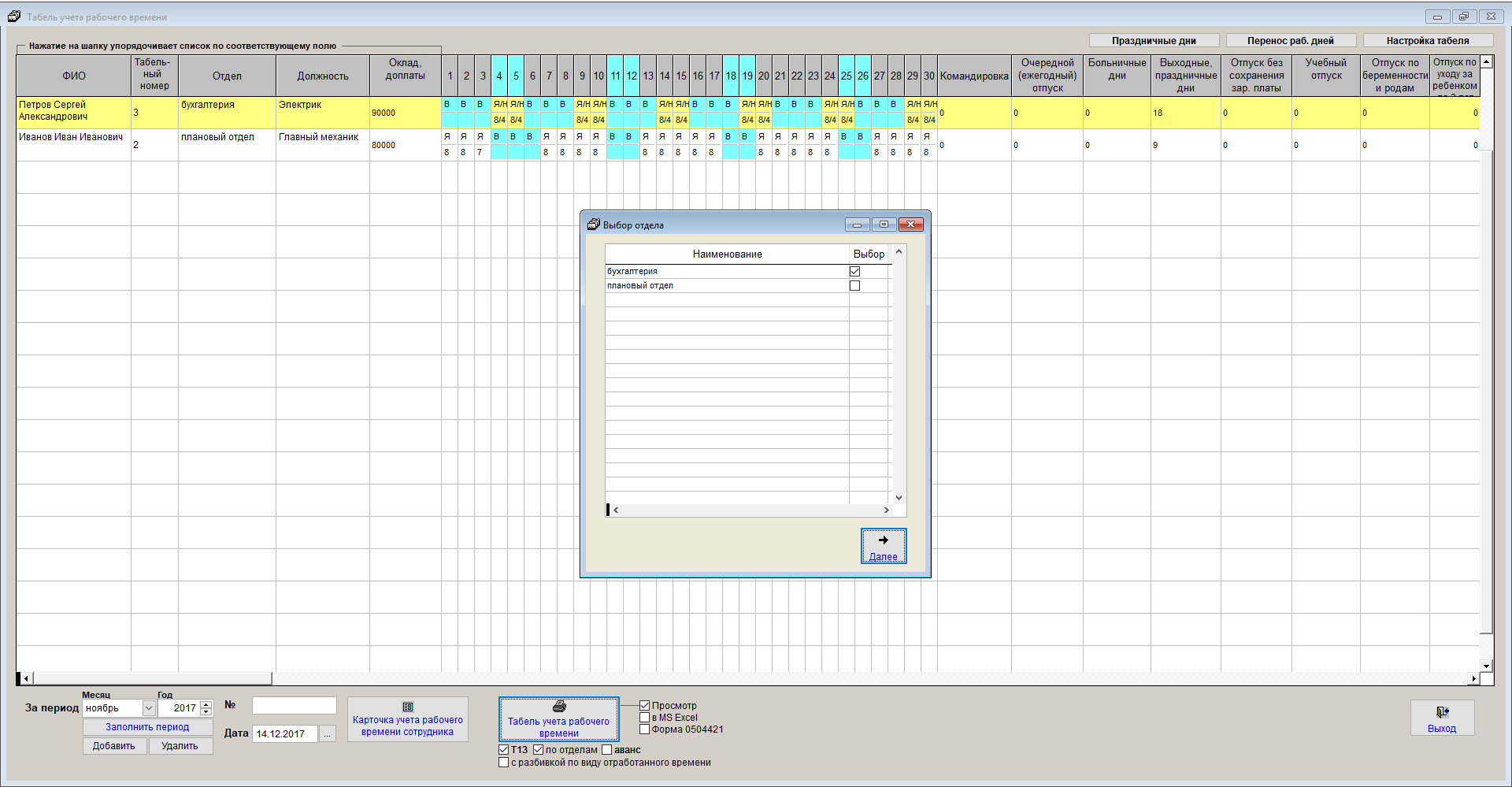 Будет сформирован табель для выбранных отделов с разбивкой по отделам.