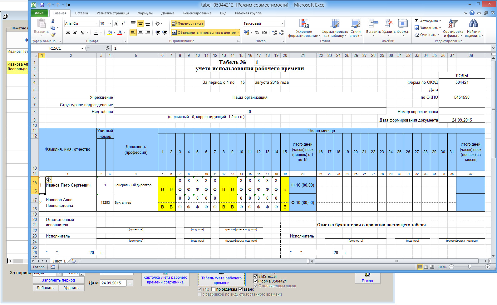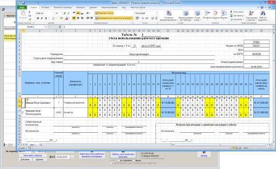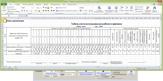 Табель с учетом отработанных часов по дням месяца будет сформирован в MS Excel (OO Calc).