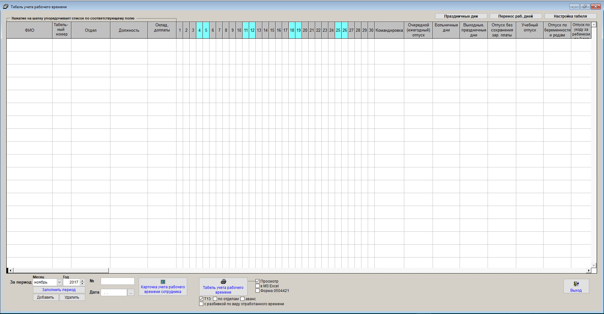 Можно указать цвет, которым будут выделяться выходные (сб,вс) в шапке табеля, а в табеле выходные и праздничные дни, больничные, различные виды отпуска, командировки и прогулы.