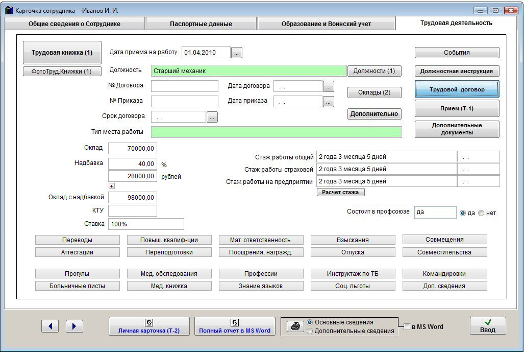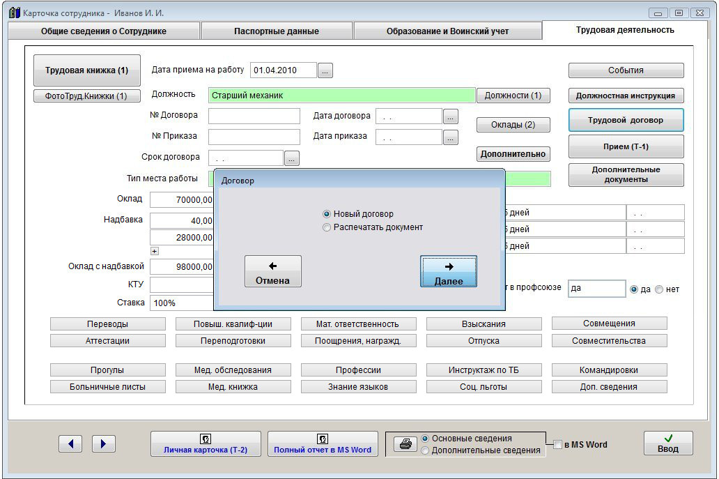 Для печати трудового договора сотрудника откройте карточку сотрудника на редактирование (кнопка Изменить карточку в журнале сотрудников) и нажмите кнопку "Трудовой договор" в закладке "Трудовая деятельность".