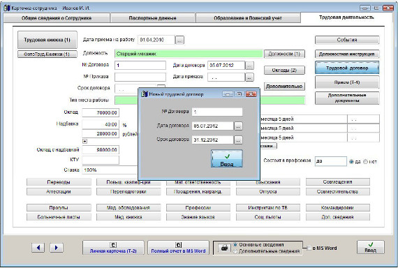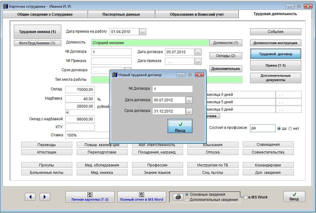 В случае, если включена автоматическая нумерация договоров, номер и дата договора заполняются автоматически при печати договора (кнопка "Трудовой договор") и последующем выборе опции "Новый договор", а запись о договоре автоматически попадет в журнал трудовых договоров.