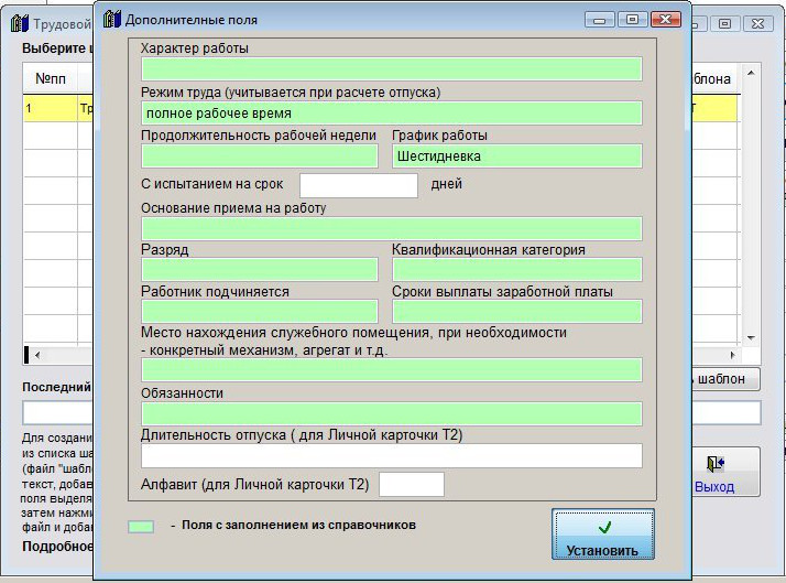 Заполните нужные поля (режим труда, характер работы, испытательный срок, основание приема на работу) и нажмите кнопку "Установить".
