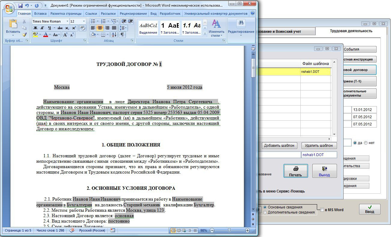 Трудовой договор сформируется в установленном Microsoft Word либо при соответствующей настройке в OpenOffice Writer.