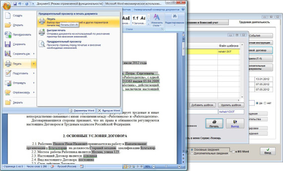 В программе есть возможность формировать трудовые договоры в установленном Microsoft Word либо при соответствующей настройке в OpenOffice Writer на базе своих шаблонов.