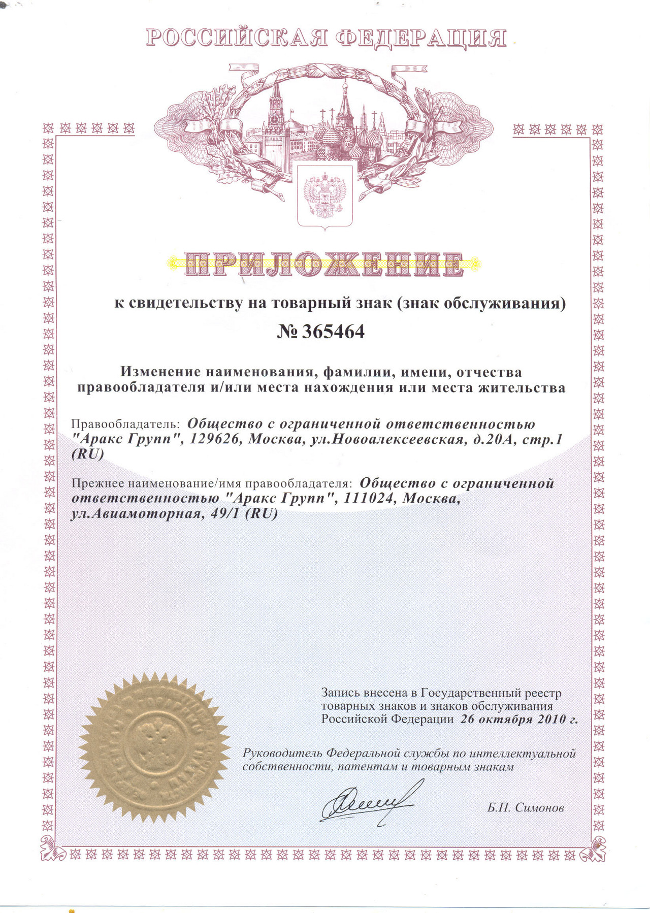 Приложение к свидетельству на товарный знак "Araxgroup" (знак обслуживания) №365464, изменение места нахождения компании-правообладателя ООО "Аракс Групп", запись внесена 26 октября 2010 года.