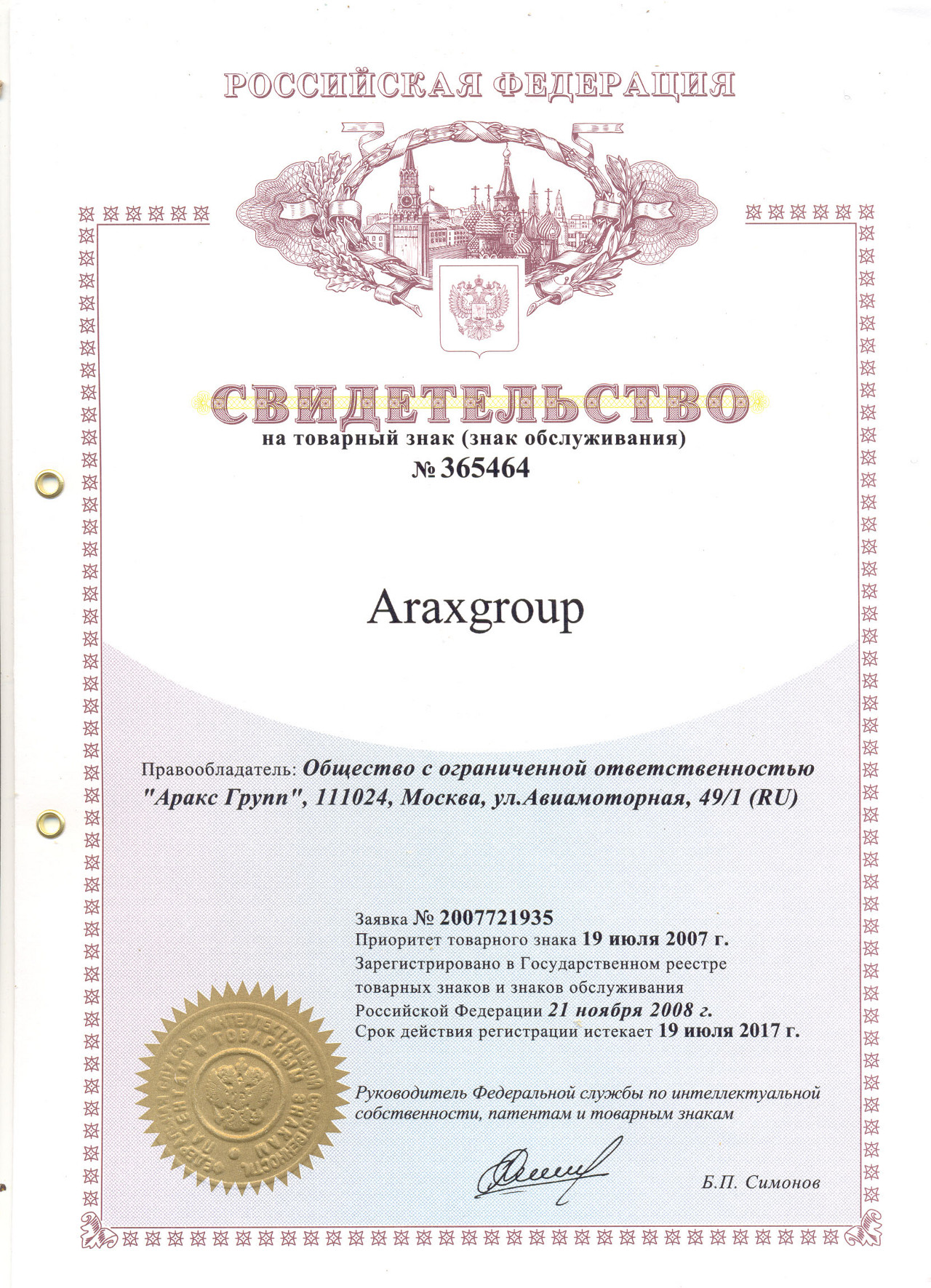 Свидетельство на товарный знак "Araxgroup" (знак обслуживания) №365464, приоритет товарного знака 19 июля 2007 года.