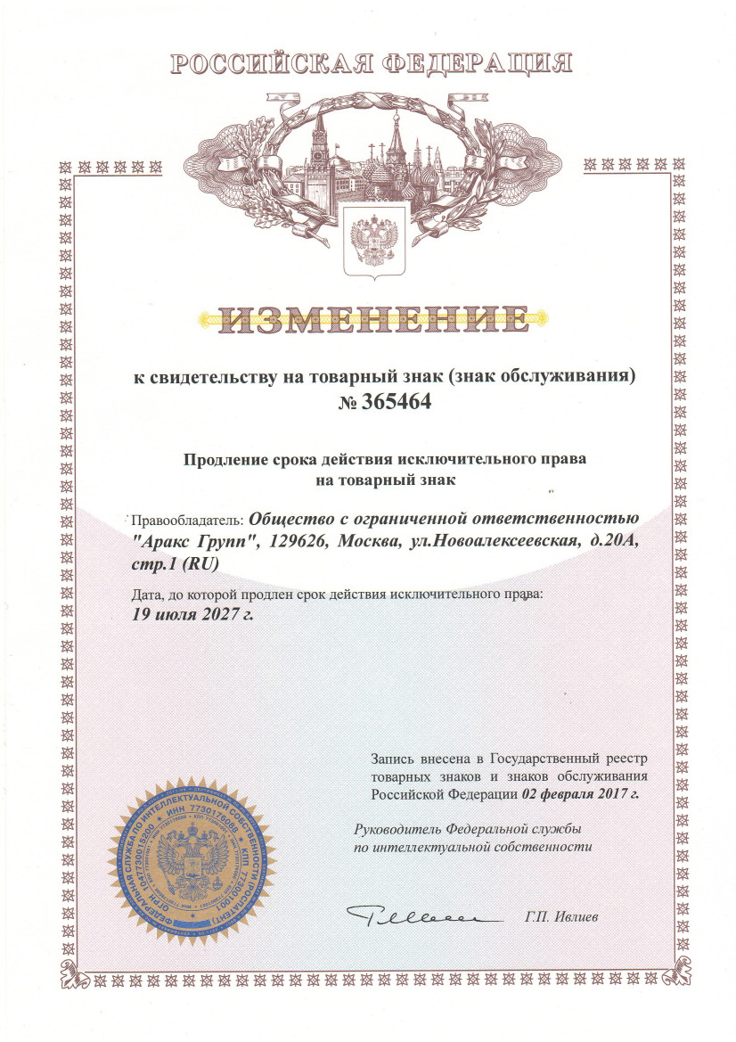 Изменение к свидетельству на товарный знак "Araxgroup" (знак обслуживания) №365464, продление срока действия исключительного права на товарный знак до 19 июля 2027 года, запись внесена 02 февраля 2017 года.
