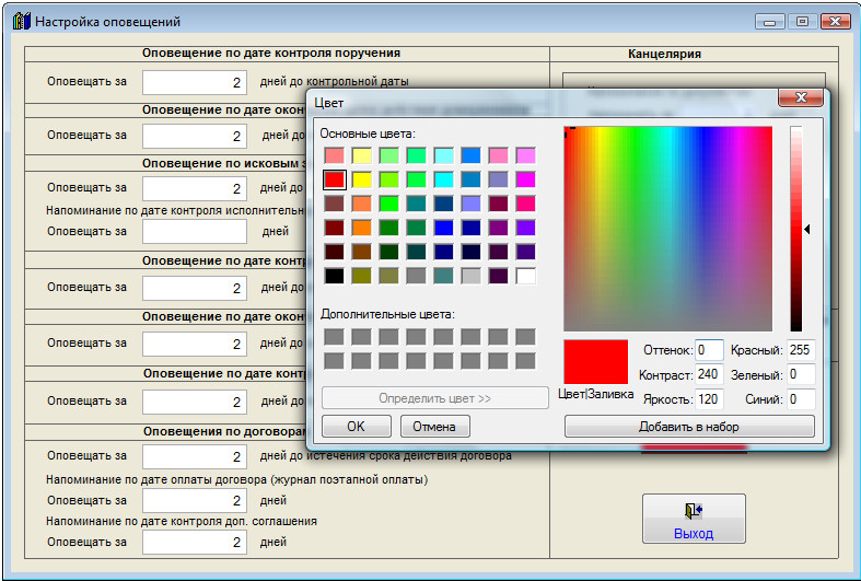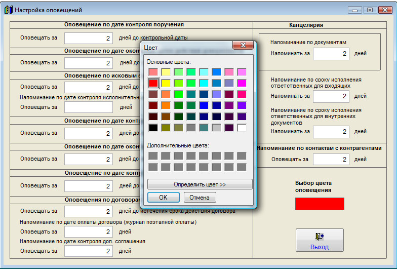 Для выбора цвета, которым будут отображаться в журналах регистрации документы на контроле в программе "Юридический офис" выберите раздел меню "Сервис-Настройка оповещений".
