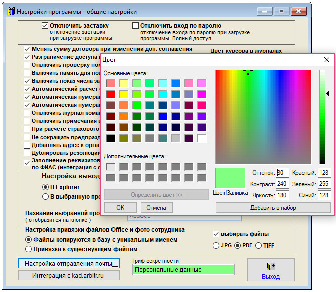 Для выбора цвета, которым будут отображаться в журналах и карточках поля, заполняемые из справочников в программе "Юридический офис" выберите раздел меню "Сервис-Настройка интерфейса".