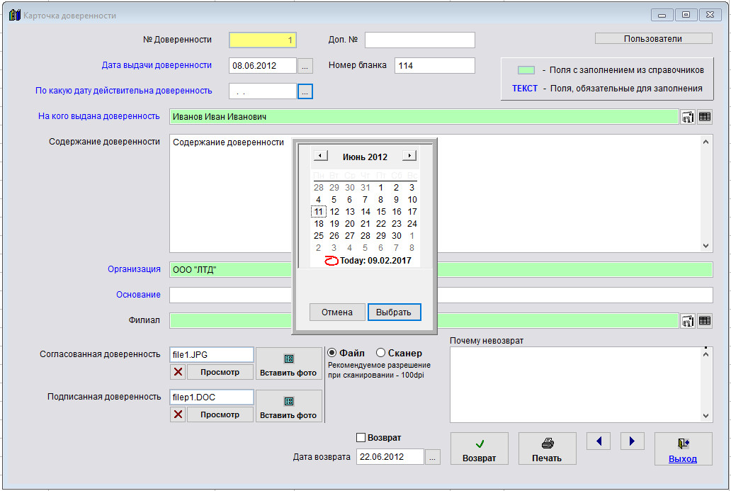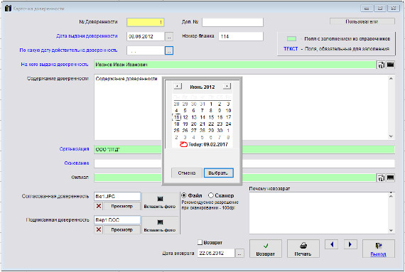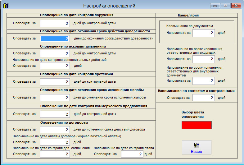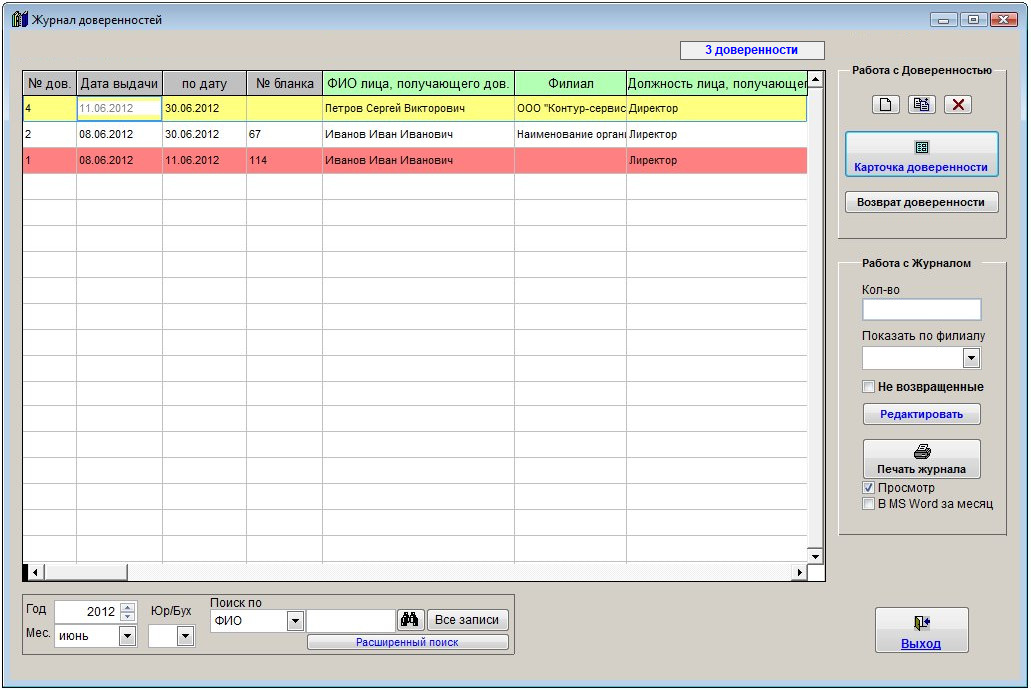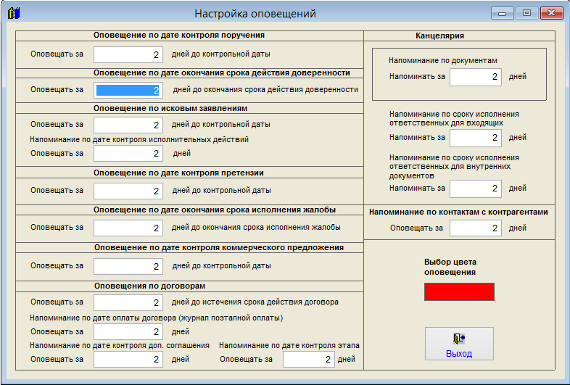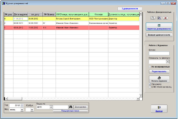 В программе "Юридический офис" существует два вида оповещений для раздела "Доверенности" - цветовое оповещение по просроченной дате окончания доверенности и оповещение при загрузке программы.