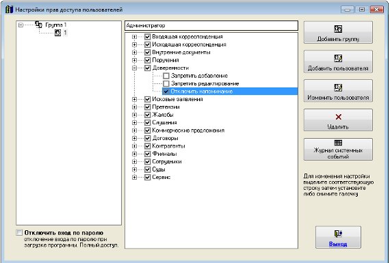 В случае, если включен вход по паролю в программу (галочка "Отключить вход по паролю" в "Настройках прав доступа пользователей" снята),