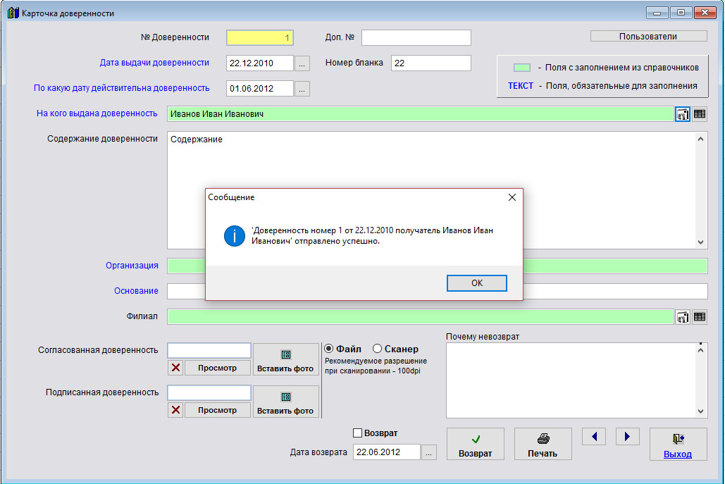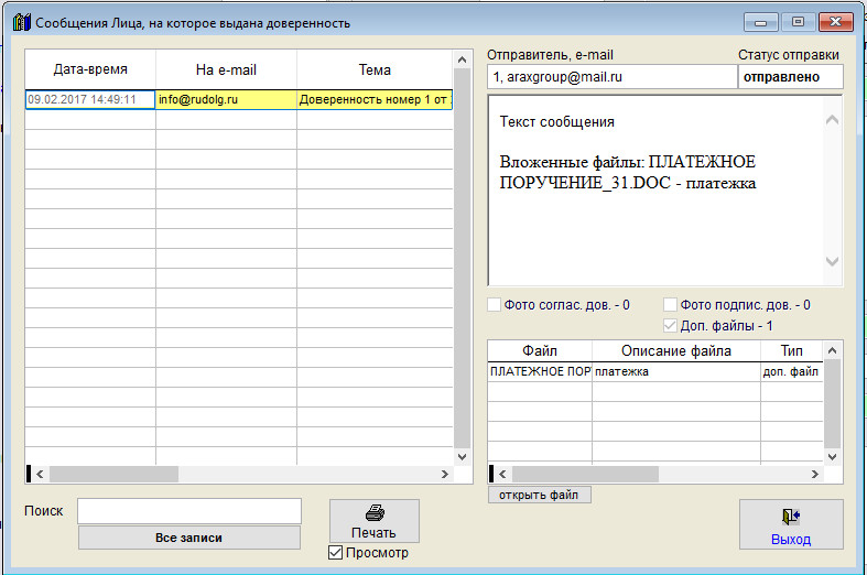 Откроются сообщения, отправленные из программы данному лицу в связи с данной доверенностью.
