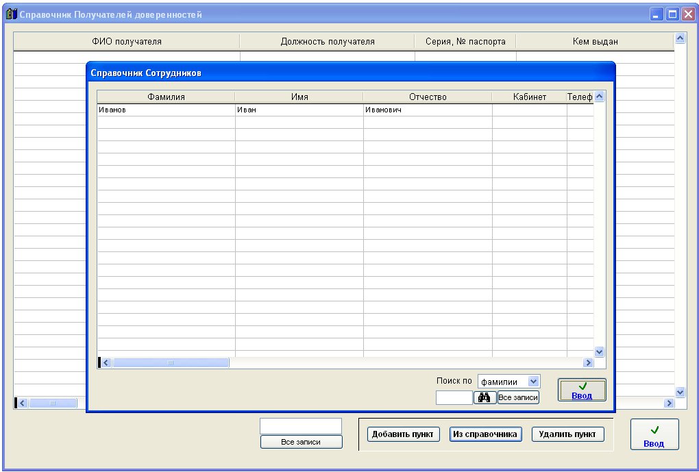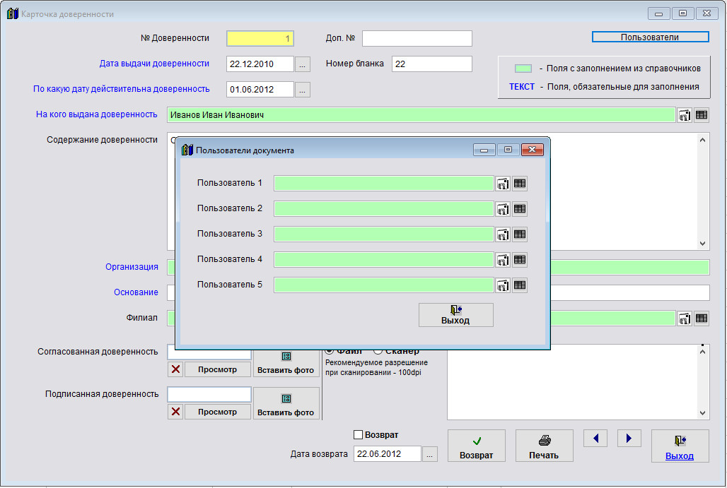 Рядом с соответствующим полем (например "На кого выдана доверенность") расположены две кнопки.