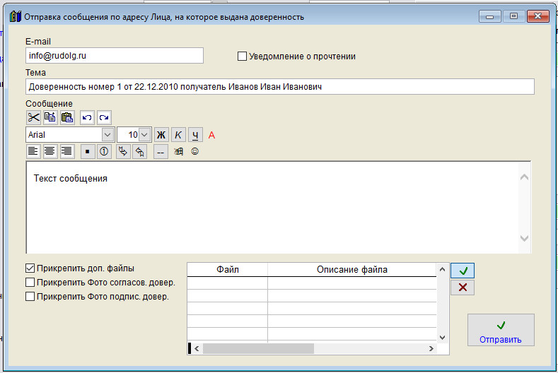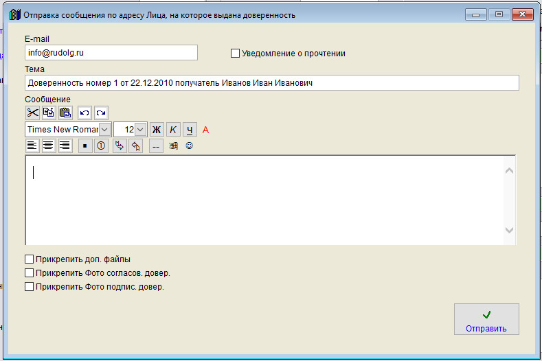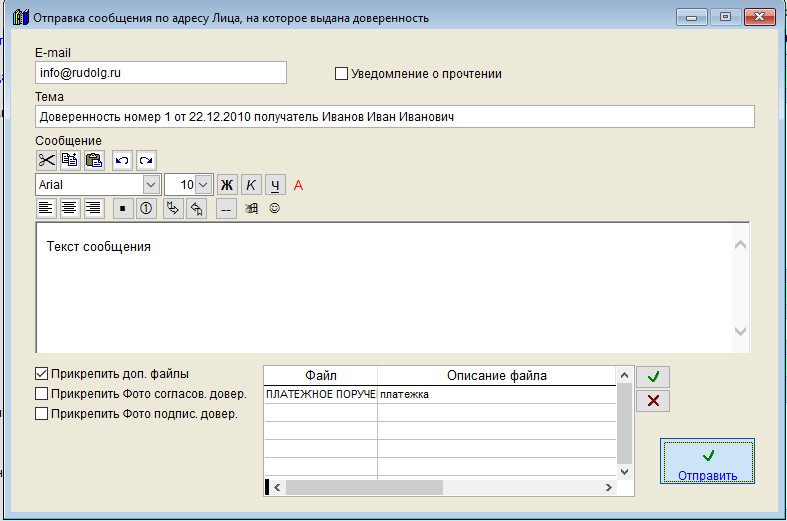 При создании сообщения лицу, получающему доверенность, e-mail будет заноситься из карточки данного сотрудника.