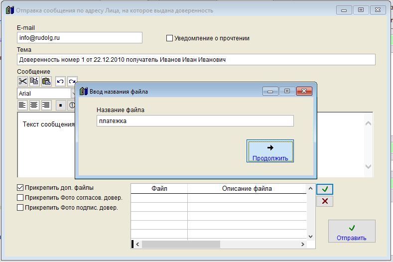 Тема сообщения также будет заполнена автоматически по правилу "Доверенность Номер доверенности от Дата доверенности получатель На кого выдана доверенность".