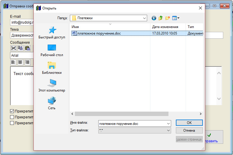 Затем в окне обзора файлов выберите файл, который Вы хотите отправить и нажмите ОК.