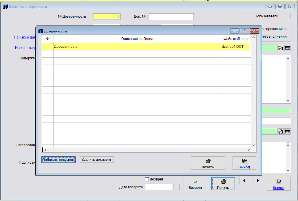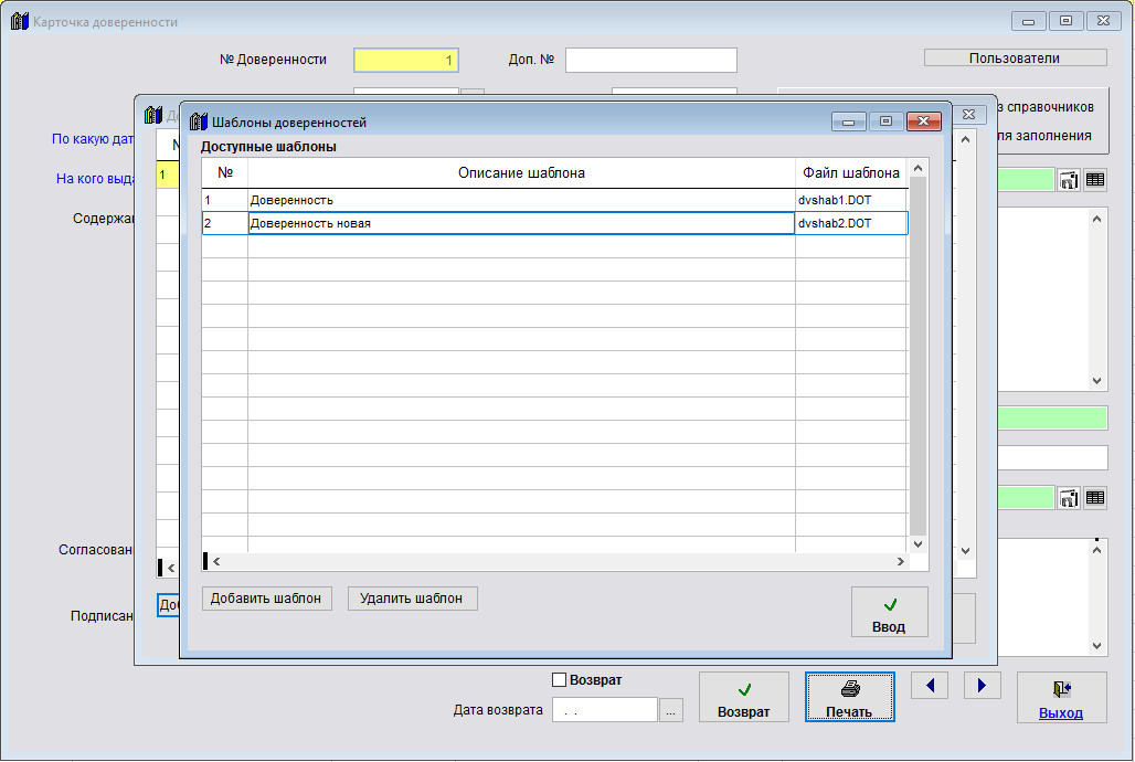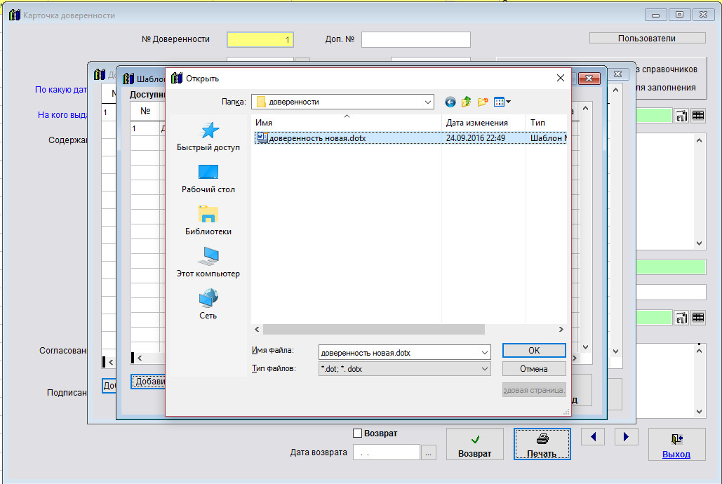 Затем нажмите Ввод и шаблон будет привязан к доверенности.