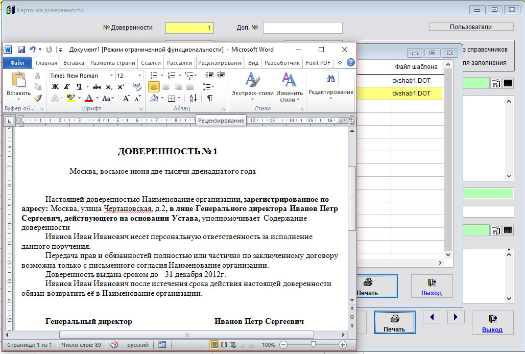 В программе "Юридический офис" есть возможность настроить вид печатной формы доверенности, которая формируется в Microsoft Word, либо, при соответствующей