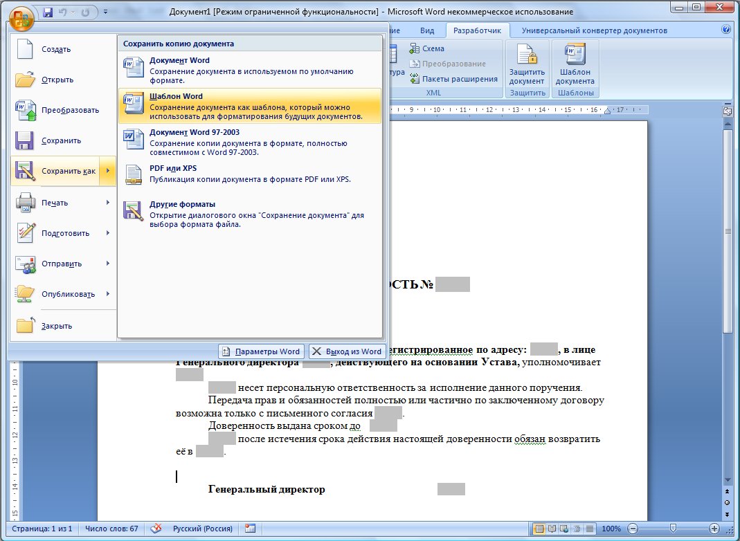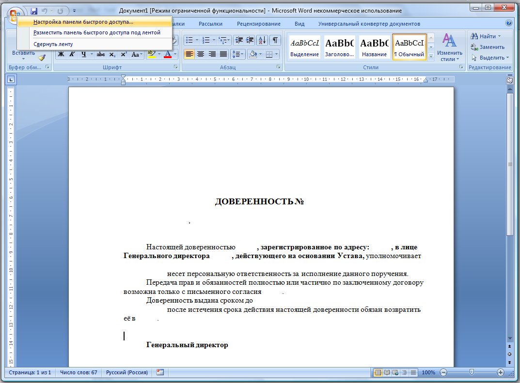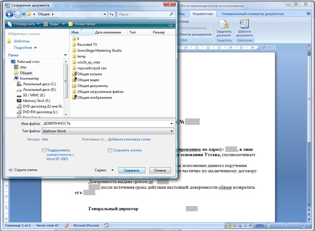 Для редактирования доверенности откройте Microsoft Word и через меню MS Word откройте файл шаблона, который Вы хотите отредактировать, выбрав файл через обзор файлов.