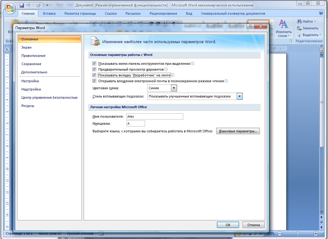 В разделе "Основные" поставьте галочку "Показывать вкладку Разработчик на ленте", затем нажмите ОК.