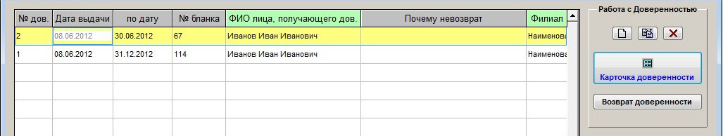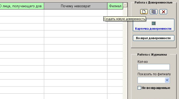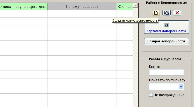 Для добавления новой доверенности в журнал нажмите кнопку "Создать новую доверенность" с изображением чистого листка справа от таблицы.
