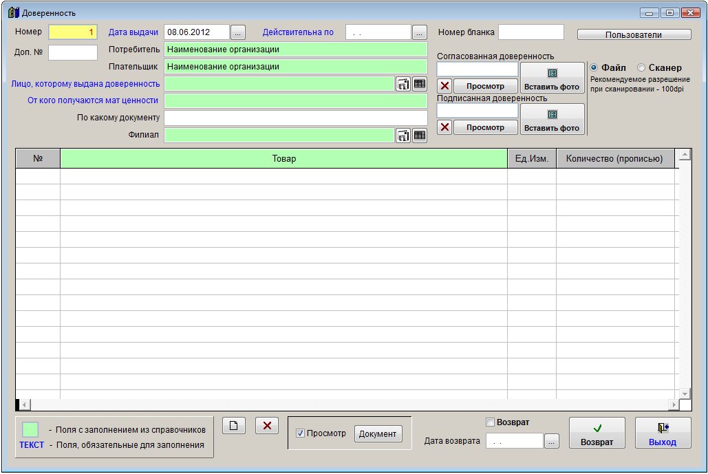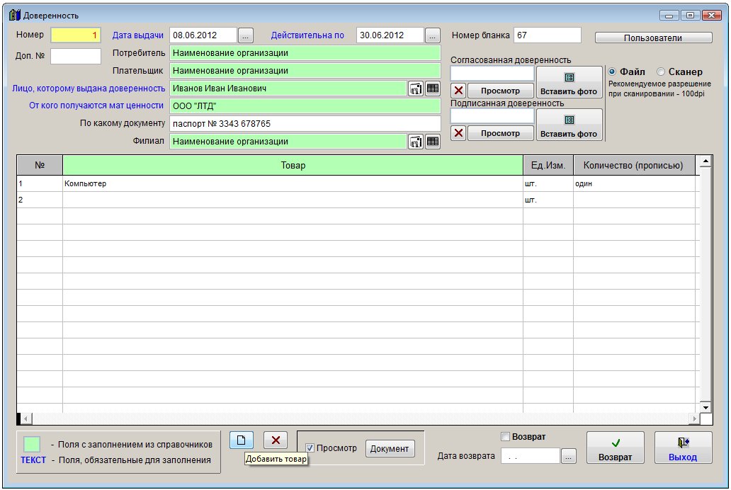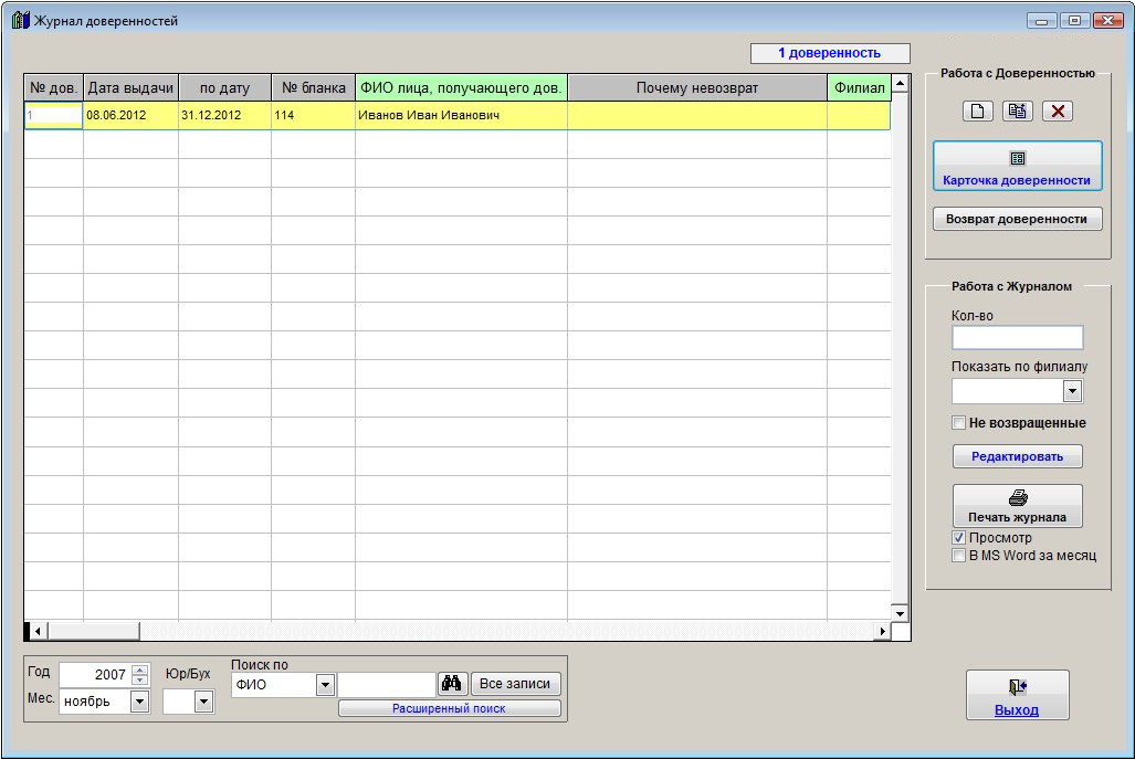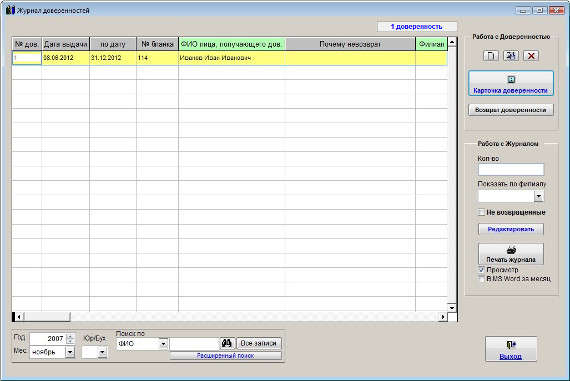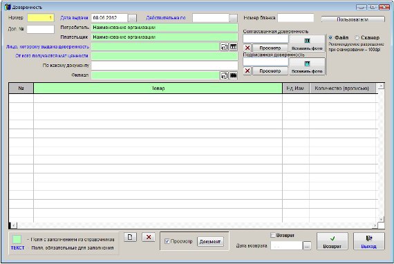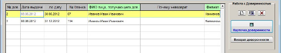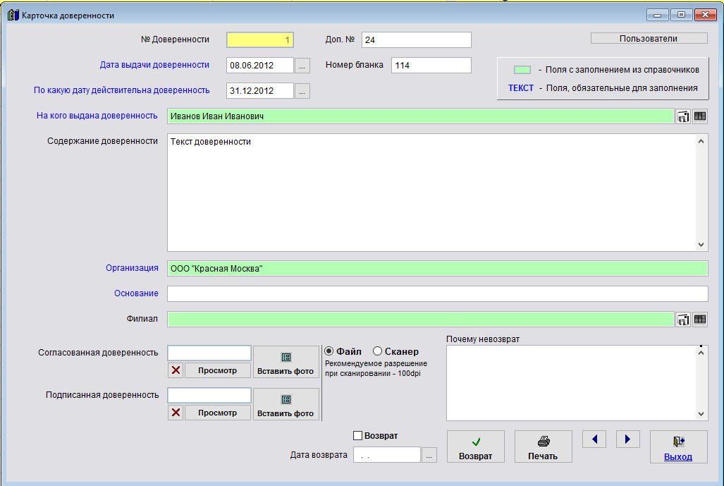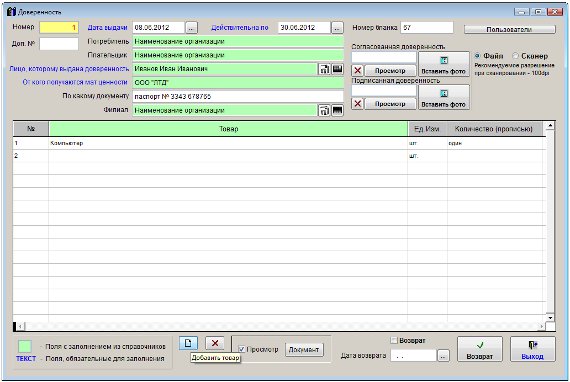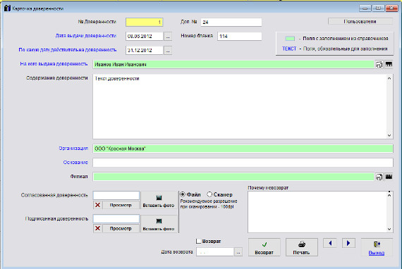 Заполните нужные поля в карточке бухгалтерской доверенности.