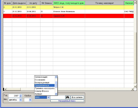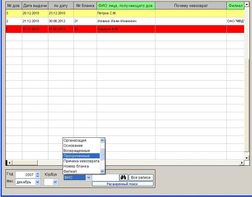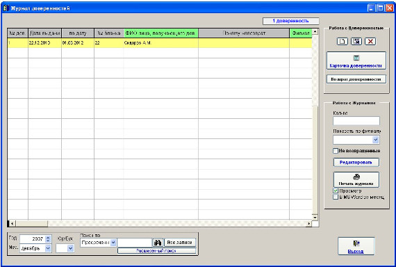 В журнале доверенностей отобразятся только те записи, которые соответствуют критерию поиска, т.е. просроченные и не возвращенные доверенности.