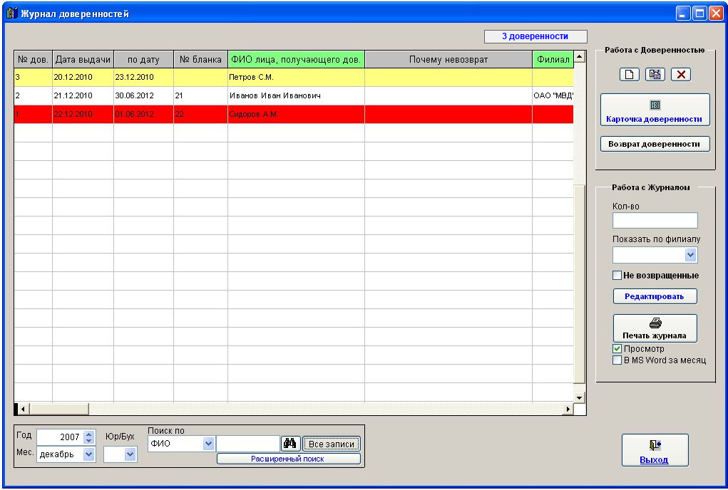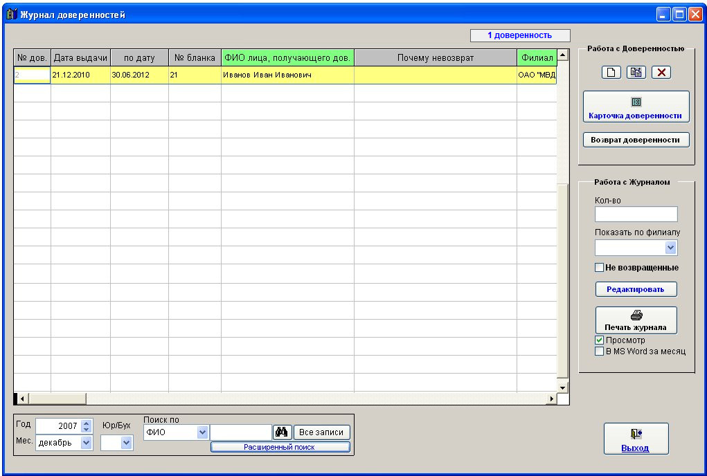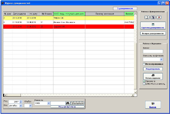 В результате выполнения поиска по журналу доверенностей в нем отображаются только записи, соответствующие критерию поиска.