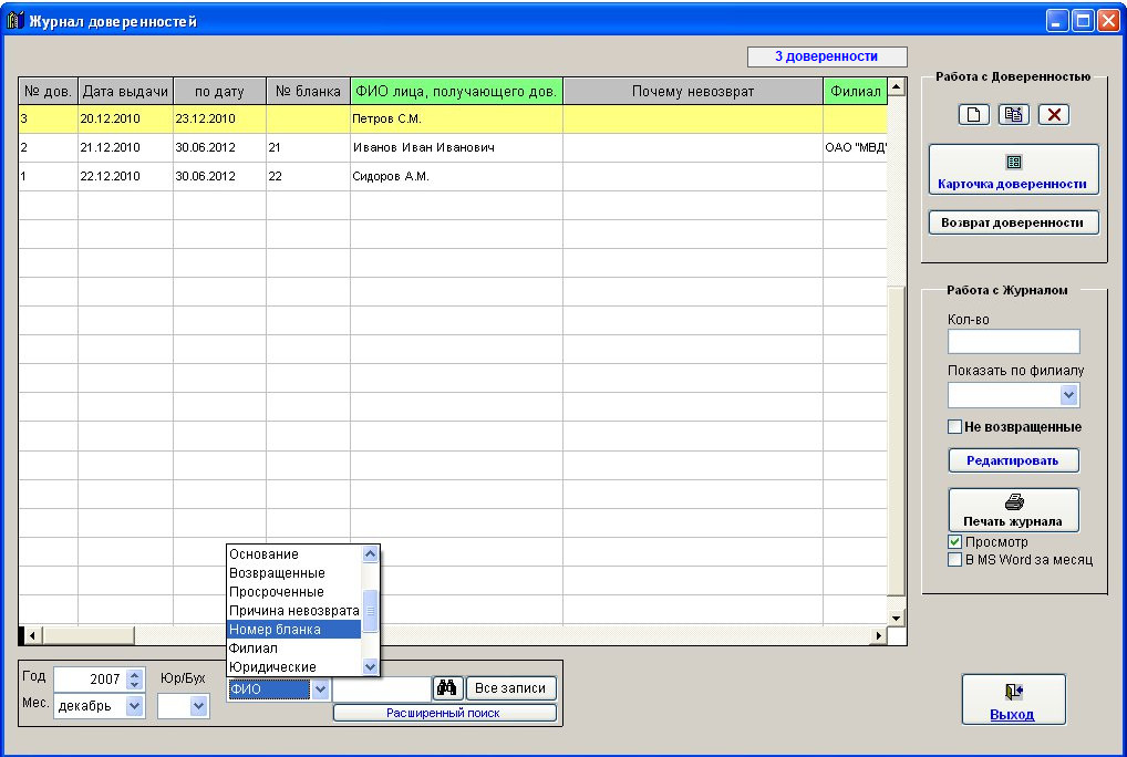 Для поиска по номеру бланка в разделе "Поиск по" под таблицей в журнале доверенностей выберите требуемый критерий поиска.