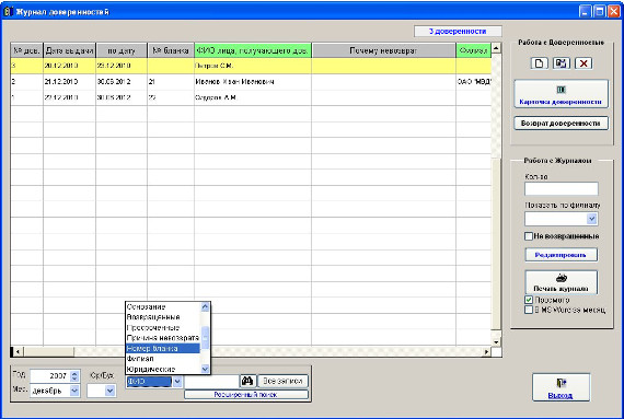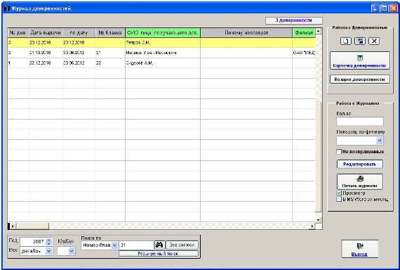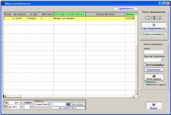 В журнале доверенностей отобразятся только те записи, которые соответствуют критерию поиска, т.е. где номер бланка доверенности содержит введенную часть номера.