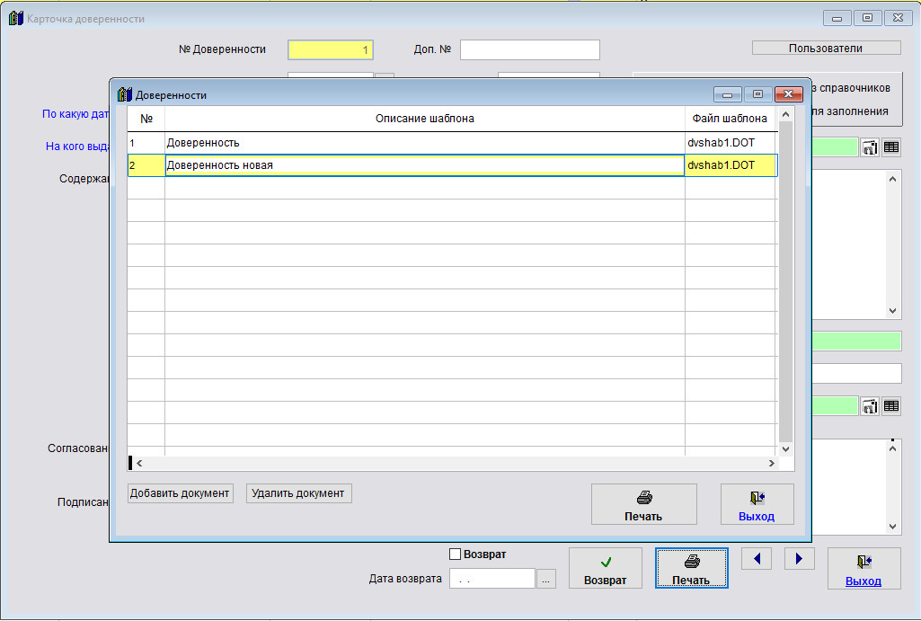 В программе "Юридический офис" есть возможность печати доверенностей на базе полей карточки доверенности, которые формируются в Microsoft Word, либо, при соответствующей