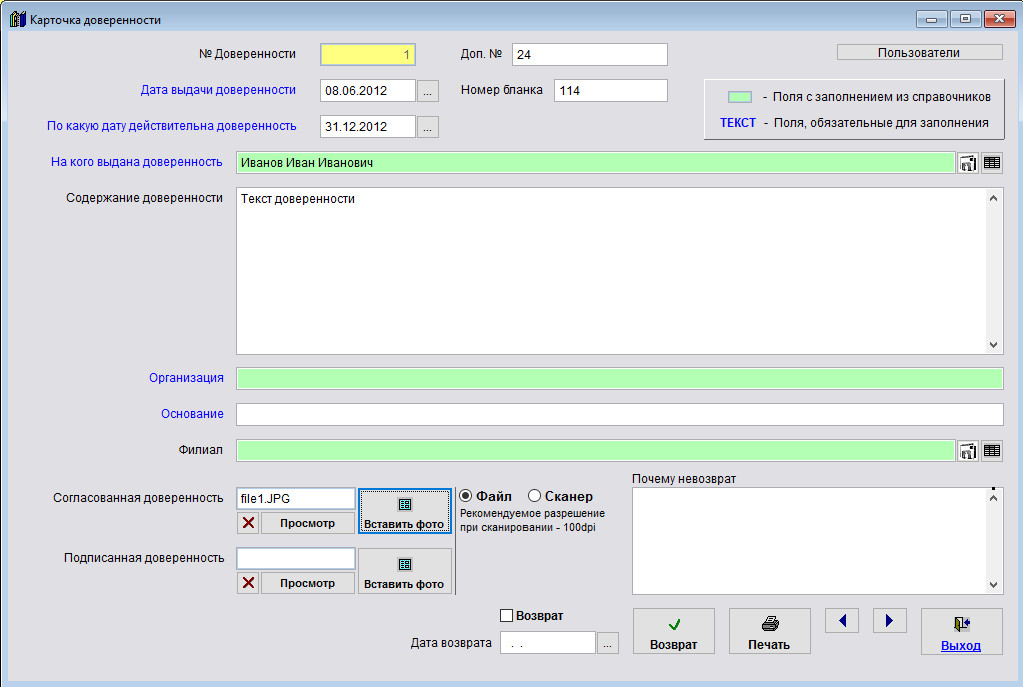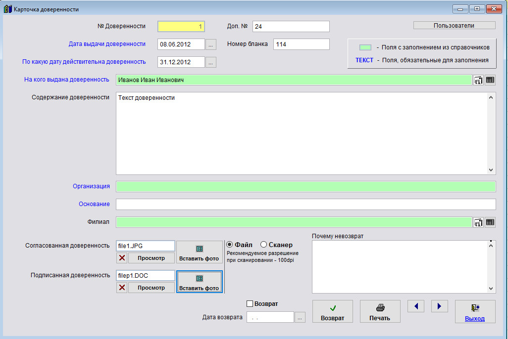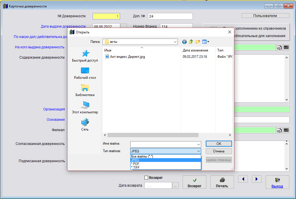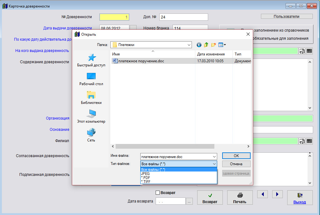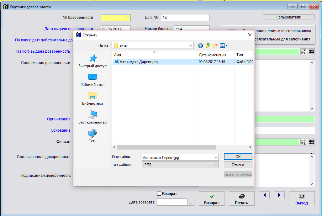 В карточке доверенности имеется возможность прикрепить отсканированные копии согласованной и подписанной доверенности.
