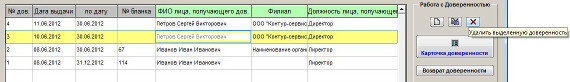 Для удаления доверенности в журнале доверенностей установите курсор на доверенность с нужным номером.