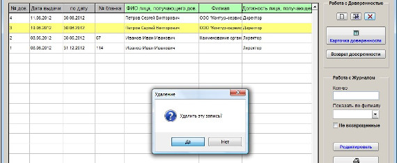 В появившемся окне нажмите кнопку "Да" для подтверждения удаления выбранной доверенности.