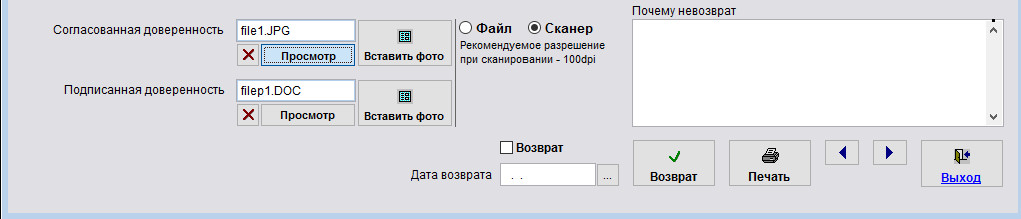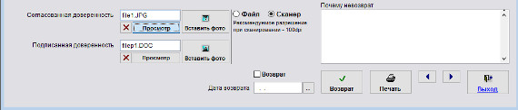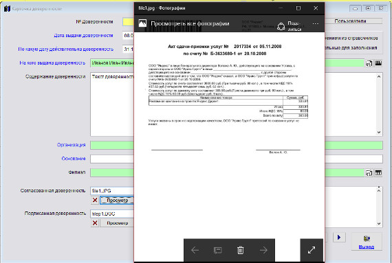 Для просмотра и вывода на печать отсканированных изображений подписанной или согласованной доверенности в карточке доверенности нажмите кнопку "Просмотр".