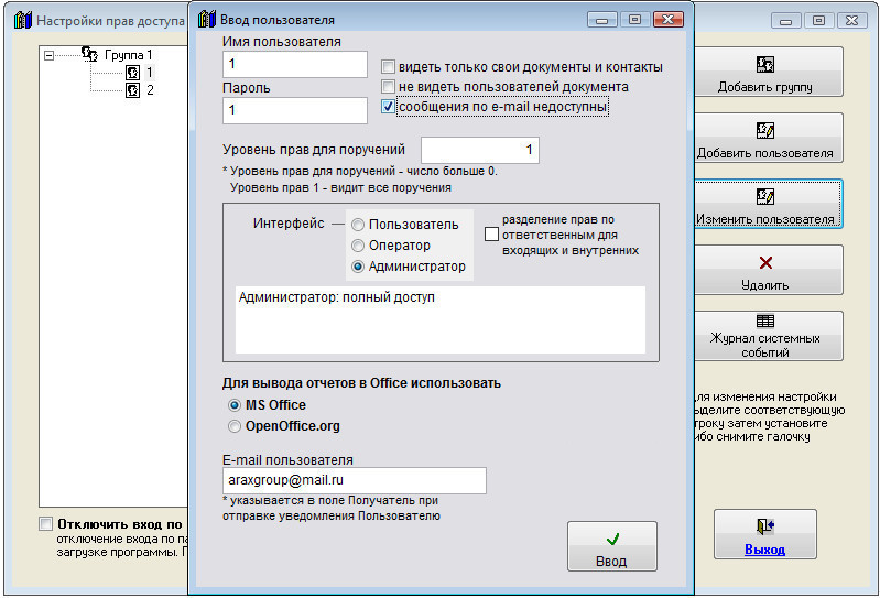 После перезапуска программы при входе под именем данного пользователя в программе будут недоступны функции отправки уведомлений по электронной почте.