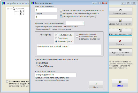 Для отключения возможности уведомлений по e-mail для конкретного пользователя выберите пункт меню Сервис-Пользователи.